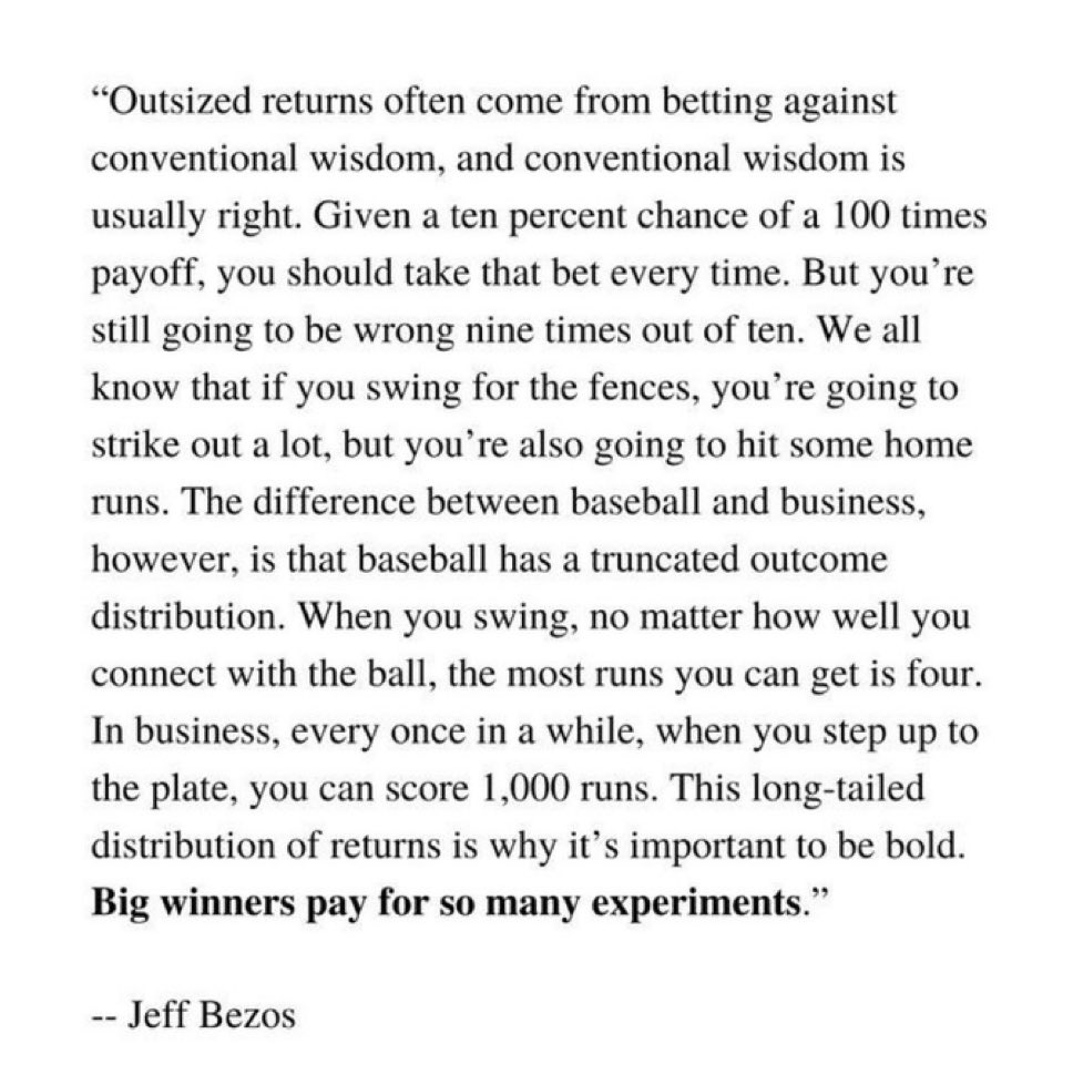 “Swing for the fences. You’ll strike out 9 times out of 10. but that one hit can score 1,000 runs. Big winners pay for so many experiments.”